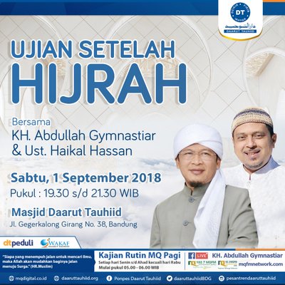 Sahabat yang baik, hadiri MABIT di Masjid Daarut Tauhiid Bandung besok malam mulai pukul 19.30 WIB, insyaAlloh hadir juga ust Haikal Hassan. Silakan di share semoga menjadi amal sholeh dan menambah keberkahan. -Admin-